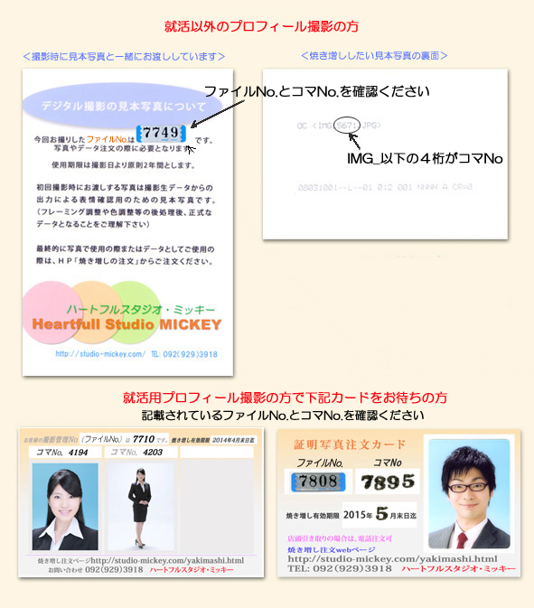 撮影時にお渡しした、注文カードまたは、写真の裏を参照し、ファイルNo.とコマNoを確認して.ください。